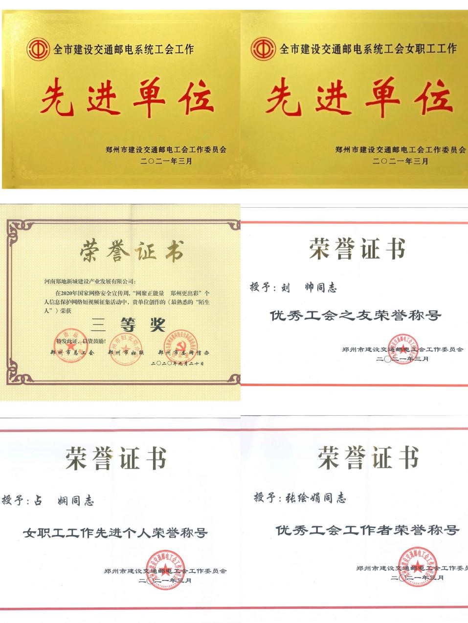2021年3月22日,經(jīng)鄭州市建設(shè)交通郵電工會工作委員會研究決定,授予我公司工會鄭州市建設(shè)交通郵電系統(tǒng)“2020年度工會工作先進(jìn)單位”和“2020年度女職工工作先進(jìn)單位”榮譽(yù)稱號,并授予劉帥同志鄭州市建設(shè)交通郵電系統(tǒng)“2020年度工會之友”榮譽(yù)稱號,新城公司工會的占嫻和張繪娟兩位同志分別被評選為“優(yōu)秀工會女職工工作”和“優(yōu)秀工會工作者”先進(jìn)個人。