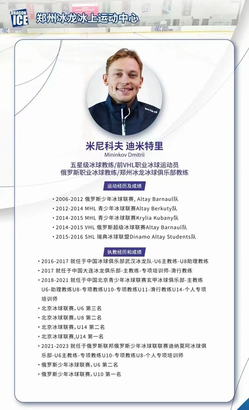 鄭州奧體冰龍冰上運(yùn)動(dòng)中心是一座現(xiàn)代化冰上訓(xùn)練綜合場(chǎng)館。新年伊始,冰龍冰上運(yùn)動(dòng)中心迎來國際知名冰球教練米尼科夫·迪米特里,國家E級(jí)教練員趙鐵北、馬騰飛入駐,將通過豐富的執(zhí)教經(jīng)驗(yàn)和專業(yè)知識(shí),為河南冰雪運(yùn)動(dòng)注入鮮活動(dòng)力!