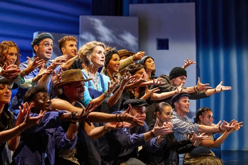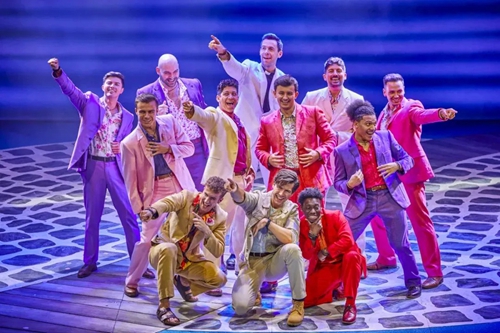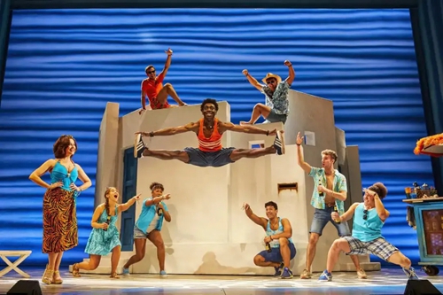 迪斯科風(fēng)格在《媽媽咪呀!》中無處不在。從音樂、舞蹈,到服裝設(shè)計(jì),都給人以舞廳“蹦迪”的動(dòng)感與歡樂體驗(yàn)。而ABBA 樂隊(duì)熱情洋溢的曲風(fēng),轉(zhuǎn)化成希臘島嶼的陽光、沙灘,所有的金曲與熱舞也洋溢著地中海燦爛陽光下的積極與樂觀,猶如一首生命的贊歌。正如《星期日快報(bào)》的評(píng)價(jià):