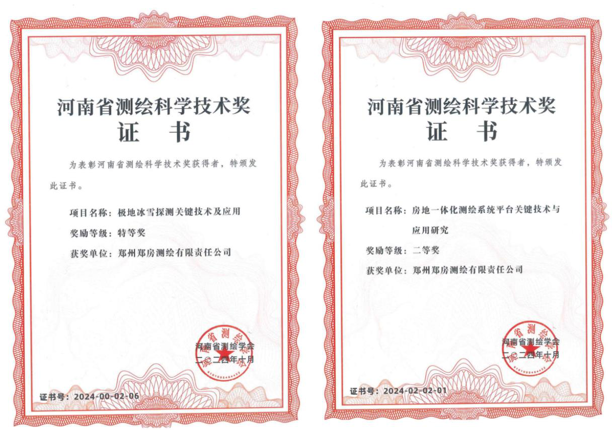 ?近期,鄭州鄭房測(cè)繪有限責(zé)任公司在科研領(lǐng)域取得重大突破,與相關(guān)單位聯(lián)合研發(fā)的《極地冰雪探測(cè)關(guān)鍵技術(shù)及應(yīng)用》和《房地一體化測(cè)繪系統(tǒng)平臺(tái)關(guān)鍵技術(shù)與應(yīng)用研究》兩個(gè)項(xiàng)目分別榮獲河南省測(cè)繪學(xué)會(huì)頒發(fā)的科學(xué)技術(shù)成果特等獎(jiǎng)和二等獎(jiǎng),為公司科技創(chuàng)新工作再添濃墨重彩的一筆。