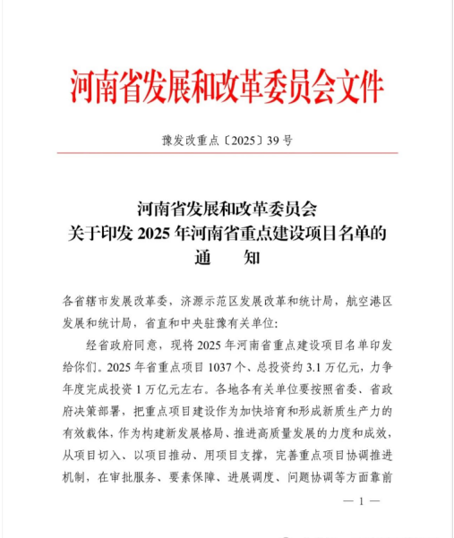1月20日,河南省發(fā)改委發(fā)布《2025年河南省重點(diǎn)建設(shè)項(xiàng)目名單》。城發(fā)·高新生物經(jīng)濟(jì)產(chǎn)業(yè)園名列其中,入選2025年河南省重點(diǎn)建設(shè)項(xiàng)目。2025年省重點(diǎn)項(xiàng)目1037個(gè)、總投資約3.1萬(wàn)億元,力爭(zhēng)年度完成投資1萬(wàn)億元左右。