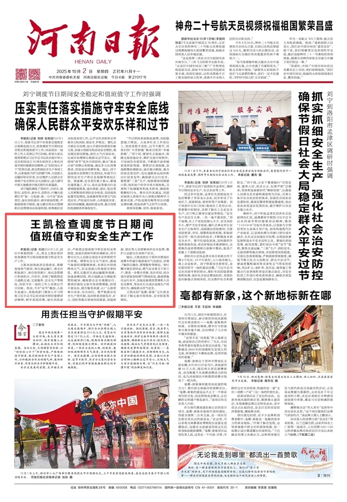 王凱來到省政府總值班室,視頻連線省氣象局、省交通運(yùn)輸廳、省文化和旅游廳、省自然資源廳、省應(yīng)急管理廳和洛陽市、開封市,詳細(xì)了解假期首日道路交通、文旅服務(wù)、安全生產(chǎn)等情況,向堅(jiān)守在一線的工作人員致以節(jié)日問候。他說,今年“雙節(jié)”疊加,人流車流量大,各地各部門要深入學(xué)習(xí)貫徹習(xí)近平總書記在河南考察時(shí)重要講話精神,樹牢底線思維,強(qiáng)化風(fēng)險(xiǎn)意識(shí),嚴(yán)格落實(shí)值班值守和信息報(bào)送等制度,加強(qiáng)會(huì)商研判和協(xié)調(diào)聯(lián)動(dòng),用辛勤付出為人民群眾創(chuàng)造平安祥和的節(jié)日環(huán)境。要密切關(guān)注天氣變化,提高氣象預(yù)報(bào)預(yù)警精準(zhǔn)度,有效應(yīng)對持續(xù)降雨天氣,切實(shí)加強(qiáng)山洪地質(zhì)災(zāi)害防范。要扎實(shí)做好交通運(yùn)輸服務(wù)保障,加強(qiáng)高峰時(shí)段、熱點(diǎn)線路運(yùn)力調(diào)配和管控疏導(dǎo),確保群眾安全便捷出行。要更好激發(fā)文旅市場消費(fèi)潛能,持續(xù)豐富業(yè)態(tài),提升服務(wù)質(zhì)量,讓廣大游客乘興而來、盡興而歸。要嚴(yán)格落實(shí)安全生產(chǎn)責(zé)任制,及時(shí)排查消除?;?、礦山、消防等重點(diǎn)領(lǐng)域風(fēng)險(xiǎn)隱患,加強(qiáng)商超、景區(qū)等人員密集場所安全監(jiān)管,維護(hù)人民群眾生命財(cái)產(chǎn)安全。